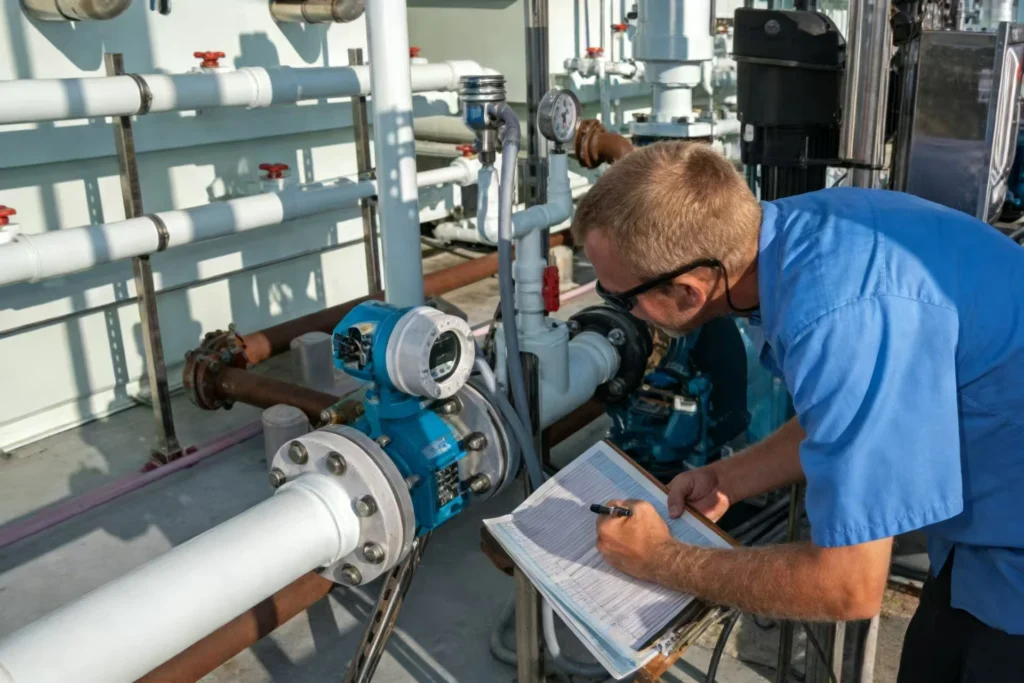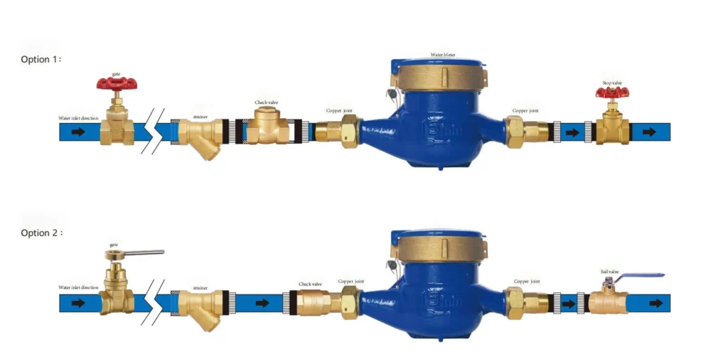 Install a shut-off valve, strainer, and check valve on the inlet side to protect the meter, and a gate or ball valve on the outlet side for flow control and maintenance. Ensure correct flow direction for accurate and reliable performance.