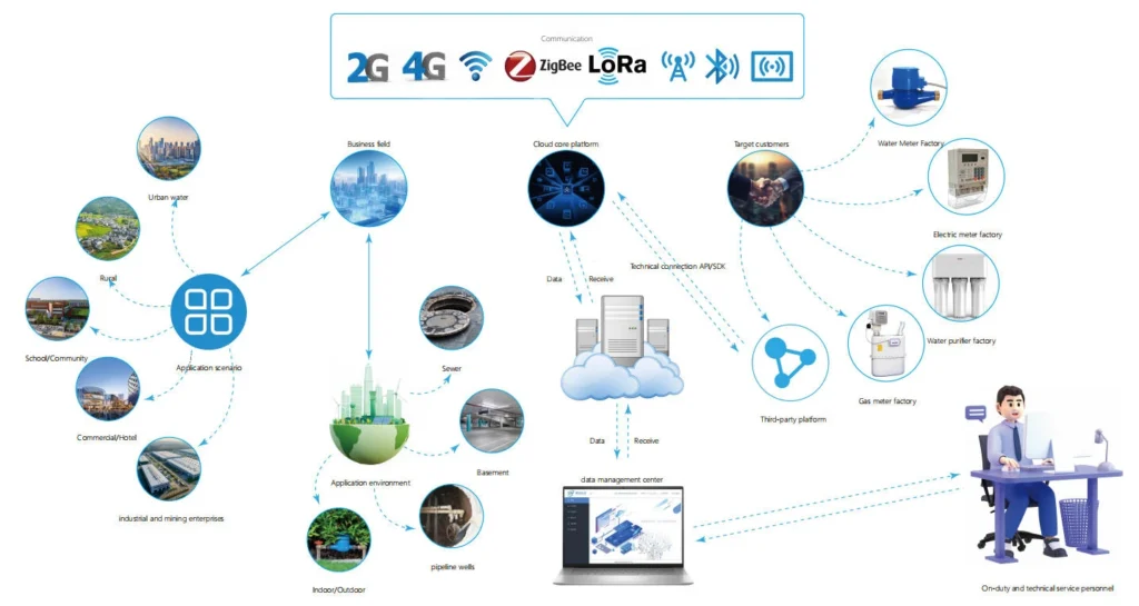 Data is transmitted to a cloud-based platform for real-time monitoring and management, with API/SDK support for easy integration into third-party systems. This enables remote meter reading, accurate data collection, and more efficient water management.